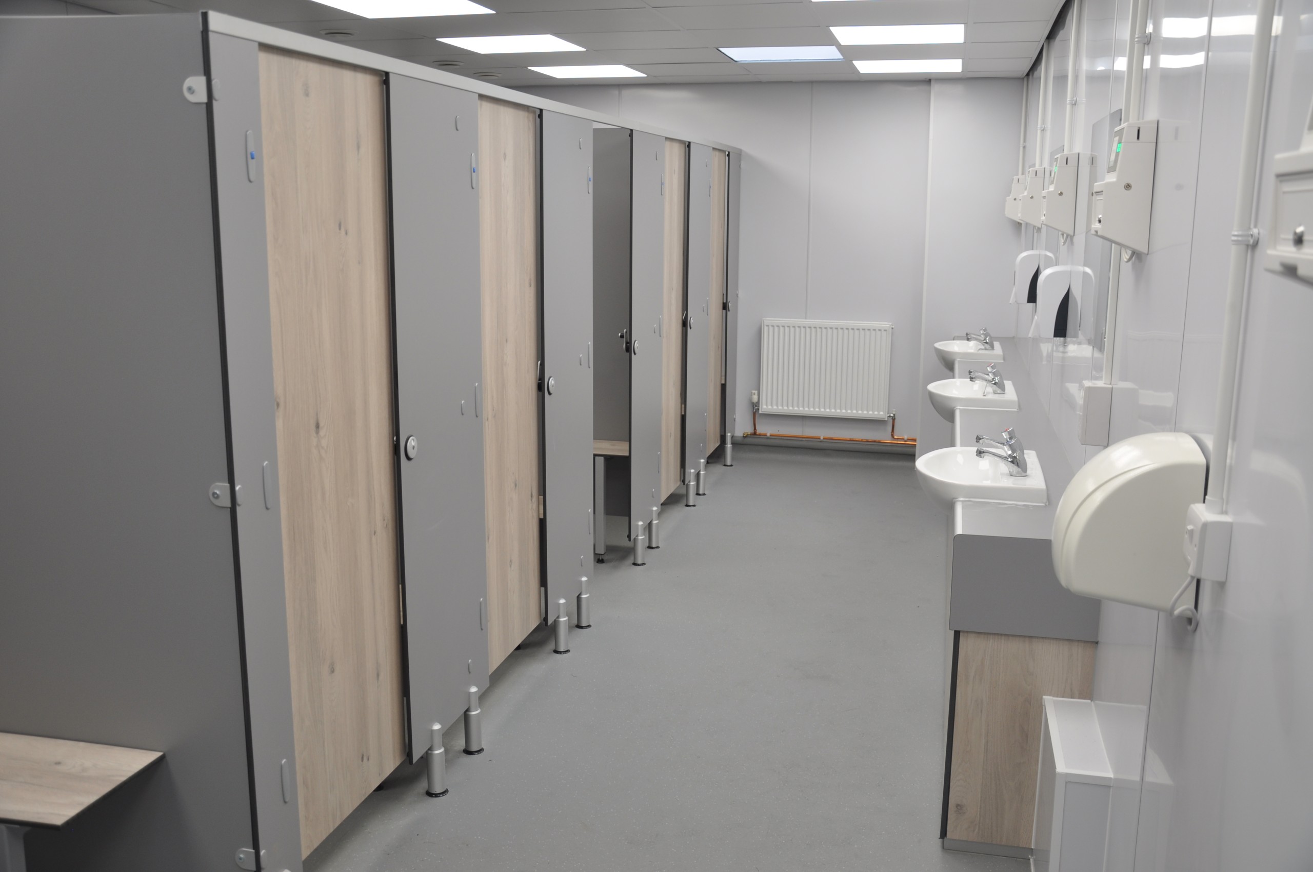 The refurbishment saw both the toilets and shower facilities being fitted out with our Cairngorm range of cubicles in a colour scheme of a classic neutral grey (Gris Cendre) for the pilasters and side panels and Chene D’Argent wood grain finish for the cubicle doors and duct panels .